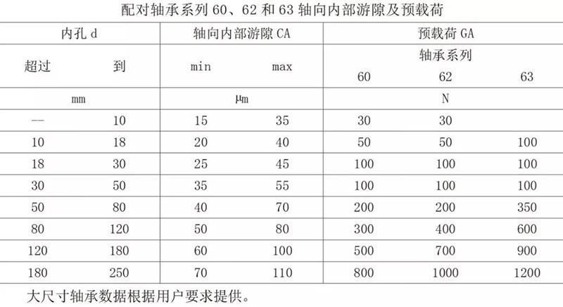 普通级深沟球轴承具有 C0组游隙,也可提供大于或小于普通级游隙的产品。双列深沟球轴承具有普通级径向游隙,背靠背或面对面组合轴承一般以下列两种形式供货较小的轴向游隙,后置代号 CA,轻型预压,后置代号 GA,60、62 和 63 系列。
